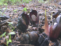 春1番に葉を広げるが、ザゼンソウと異なり、葉が枯れる頃は花がでる。